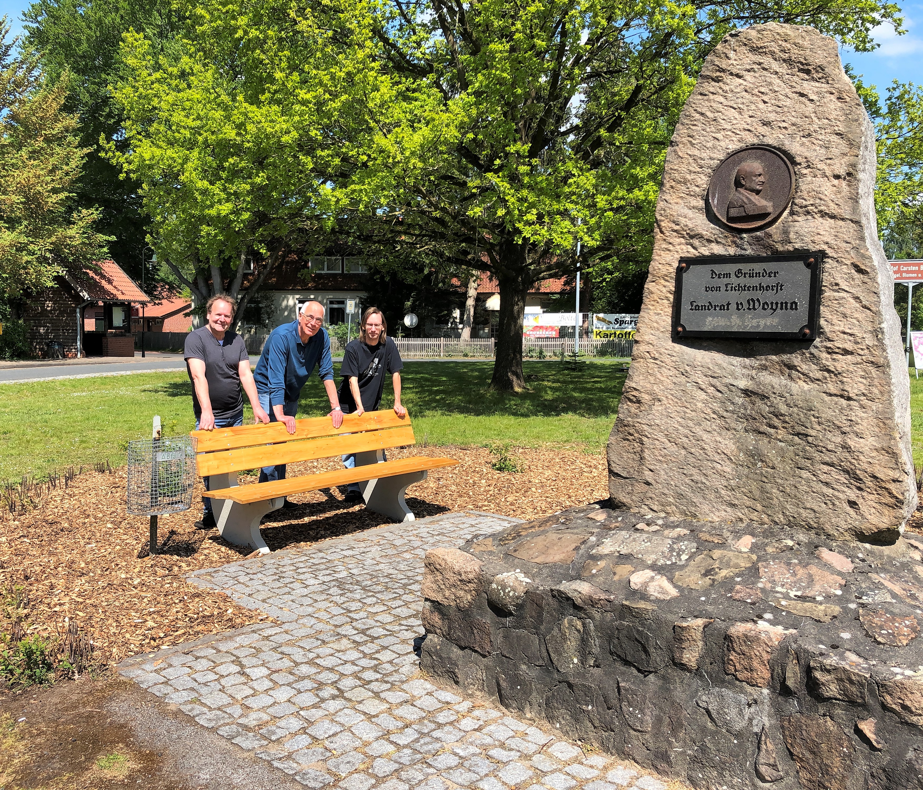 Die Arbeitsgruppe "Straßenschmuck" hat heute eine tolle Idee zum 100-Jahr Ortsjubiläum verwirklicht, ein Pflanzenbeet im Herzen von Lichtenhorst. Es stellt das Dorfwappen des Heimatverein Lichtenhorst da. Die Mühe hat sich gelohnt, schaut es euch selbst an. Ausserdem wurde das komplette Grün rund um das Denkmal neu gestaltet. Bild mitte zeigt die fleißige Helfertruppe